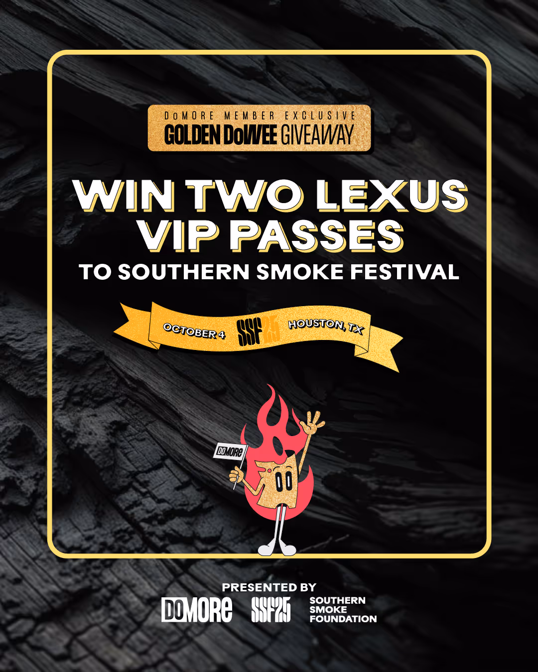 Houston’s culinary juggernaut, Southern Smoke Festival, storms Discovery Green 10/04. DoMORE members unlock the Golden DoWEE sweepstakes: two Lexus VIP passes, a Four Seasons stay, and $600 flight credit. Relish dishes from 85+ culinary luminaries, sip fine spirits, and sway to live music, all supporting food and beverage workers nationwide. The Lexus VIP lounge offers air-conditioned splendor and exclusive swag. Join DoMORE for this flyaway and future cultural quests in the DoStuff network. Sign up now - only members feast with fate.